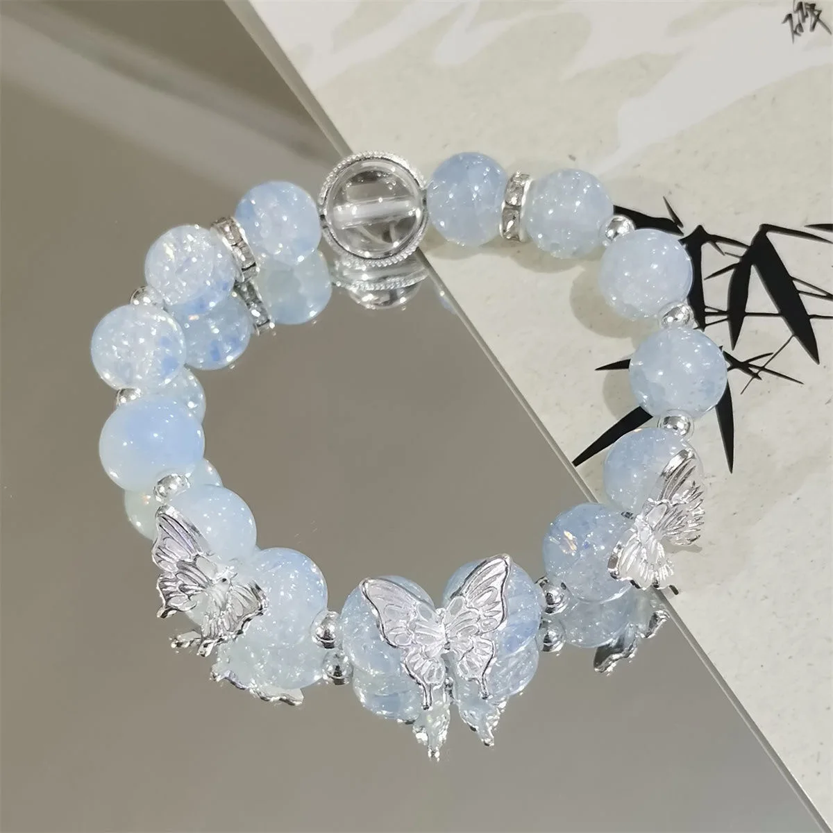 Pulsera de cuentas con colgante de mariposa y flores de cristal rosa coreano para mujer, pulseras de cadena de cuentas dulces, de joyería para novia: Chapado en zinc azul