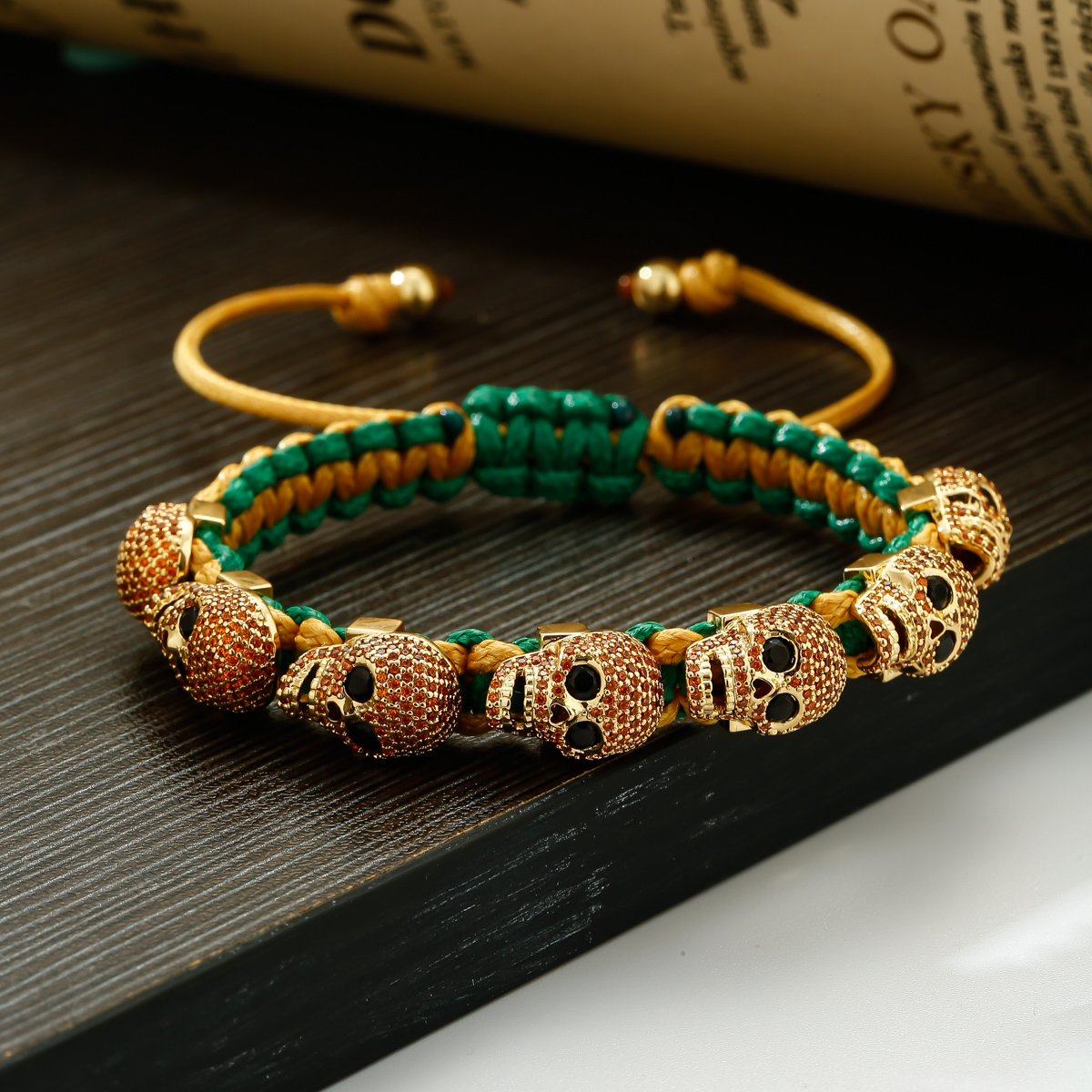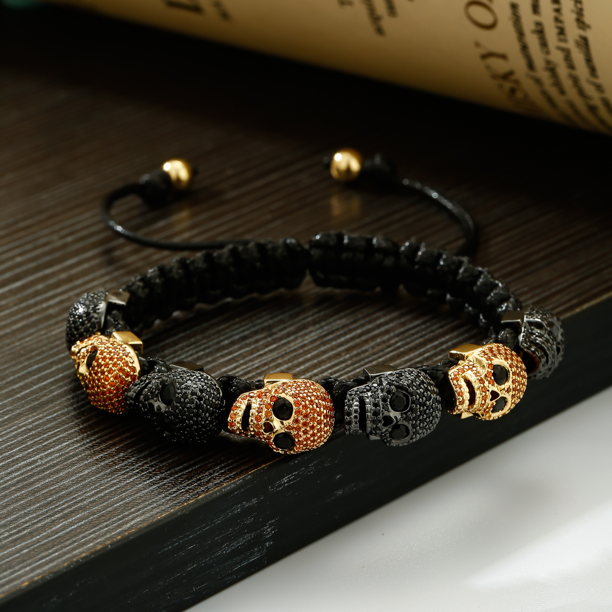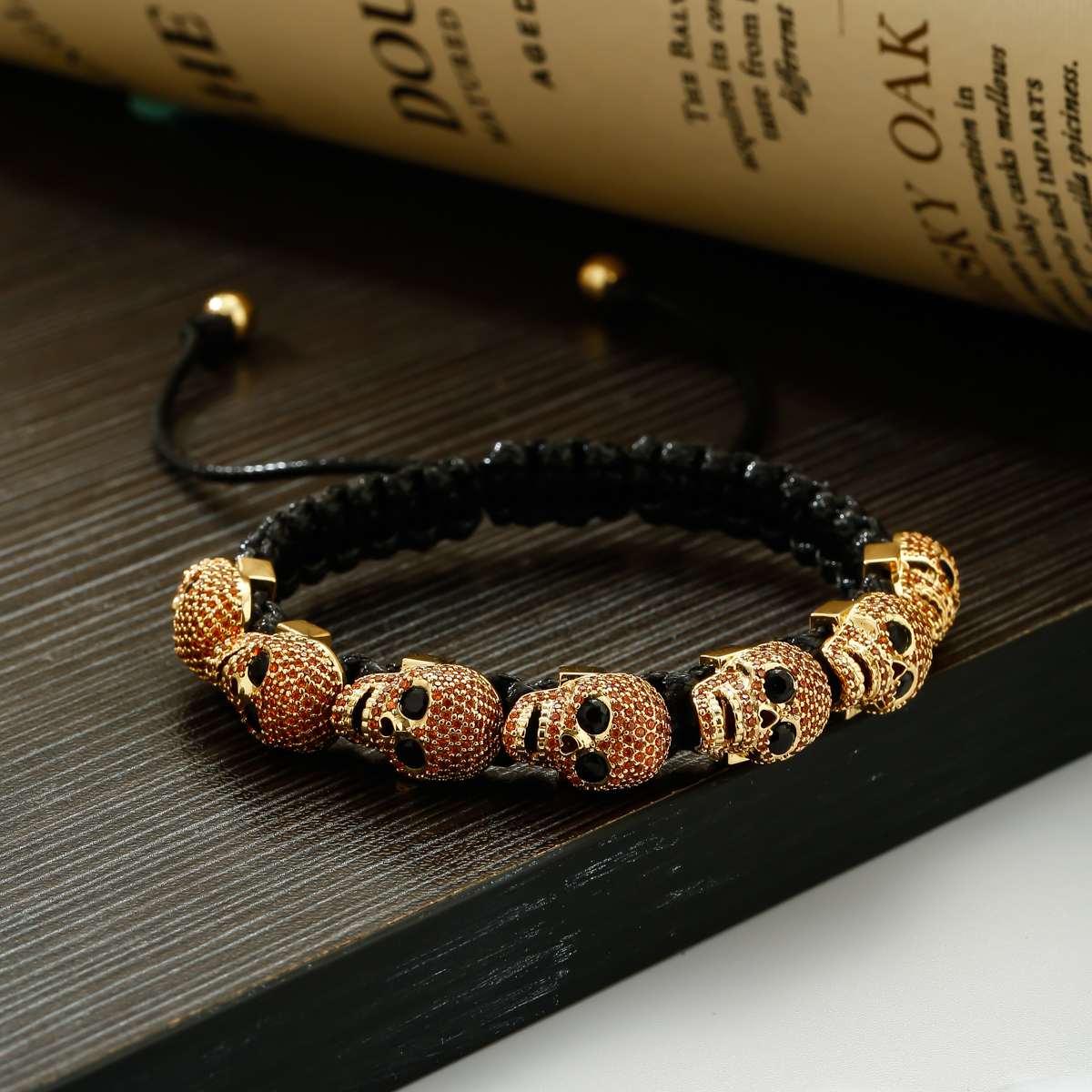 Pulsera trenzada a mano con calavera de circón para hombres y mujeres, cuentas de cobre, brazalete de cadena hecho a mano ajustable de Metal clásico