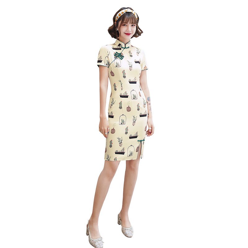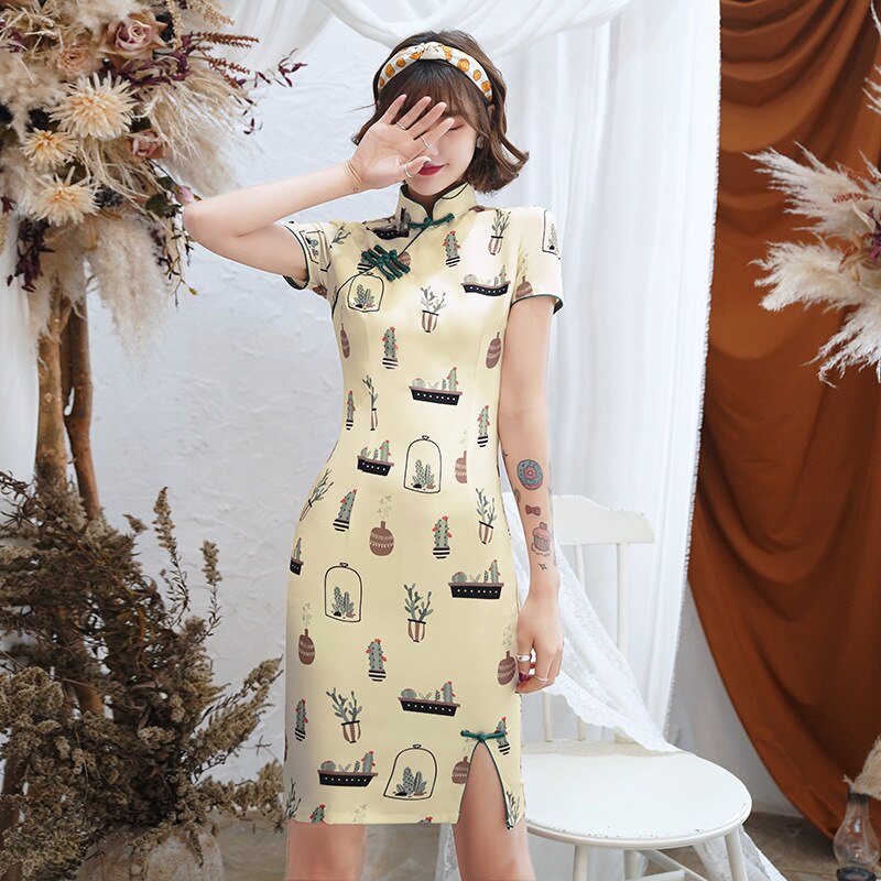 Vestido chino Qipao con cuello levantado de manga corta cheongsam mejorada temperamento corto ajustado mujeres baja split cheongsa QJ